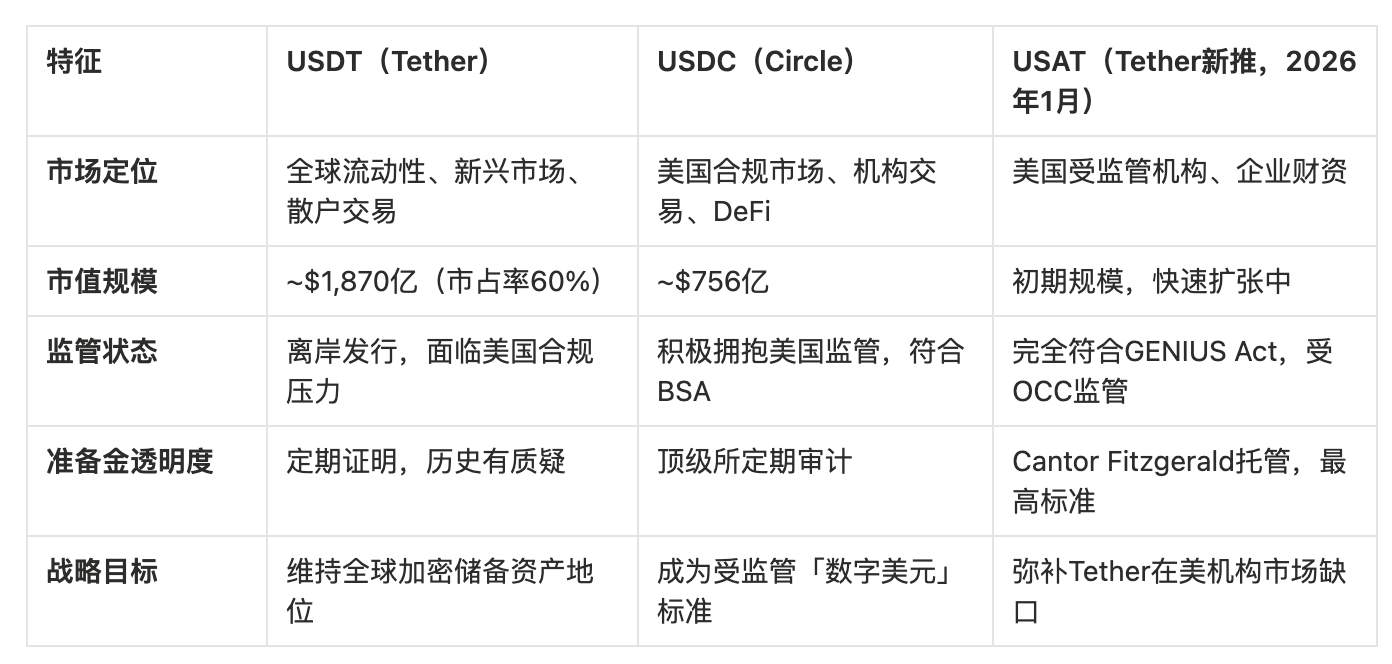 USAT 由 Anchorage Digital Bank 发行、Cantor Fitzgerald 担任托管人,完全符合 GENIUS Act 严格标准。Tether 通过这一高度合规的子品牌切入美国机构市场,同时维持 USDT 的全球主导地位——这是一场精心设计的「双品牌分线作战」:用 USDT 守住全球散户和新兴市场流动性,用 USAT 争夺美国机构资金。