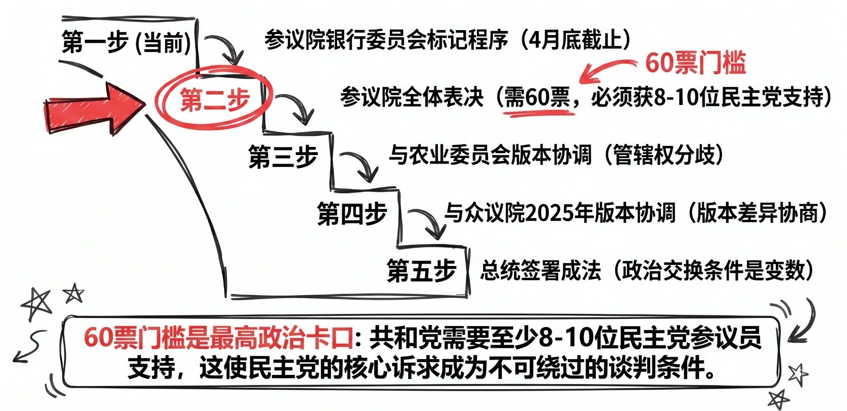 2026 年 11 月的中期选举构成最硬政治截止日:若众议院在选举中易手,亲加密的共和党立法联盟瓦解,CLARITY Act 的政治基础随之消失。参议员 Lummis 在 4 月 11 日给出了最直白的预警——「现在通过,或者等到 2030 年」。参议员 Moreno 进一步明确:若法案无法在 5 月前送达参议院全体,数字资产立法可能数年内不会再被认真对待。