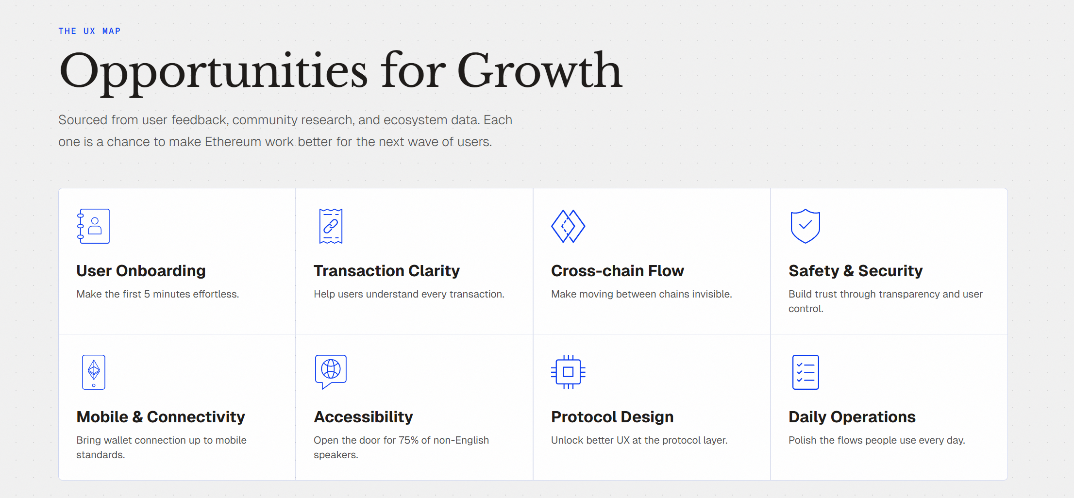 ETHUX 这张以太坊 UX 图谱,其实已经把今天链上交互的核心症结梳理得非常清楚:Transaction Clarity、Cross-chain Flow、Safety & Security 一直都是最核心的痛点类别,blind signing、signing fatigue、bridging pain、asset fragmentation 这些问题,几乎每一个老用户都不陌生。
