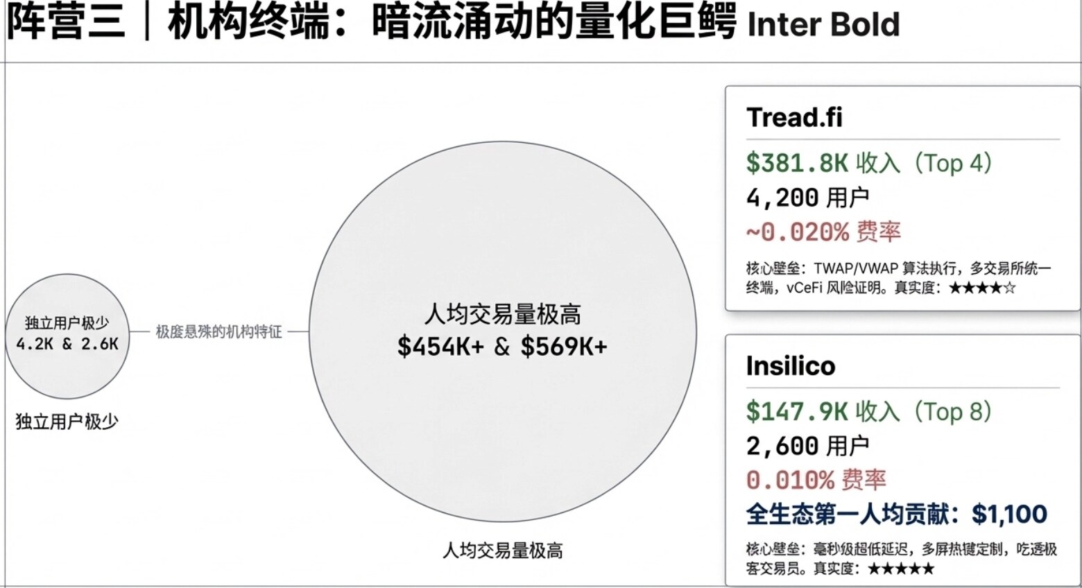 - 机构用户(Tread.fi、Insilico):用户数少,人均贡献极高