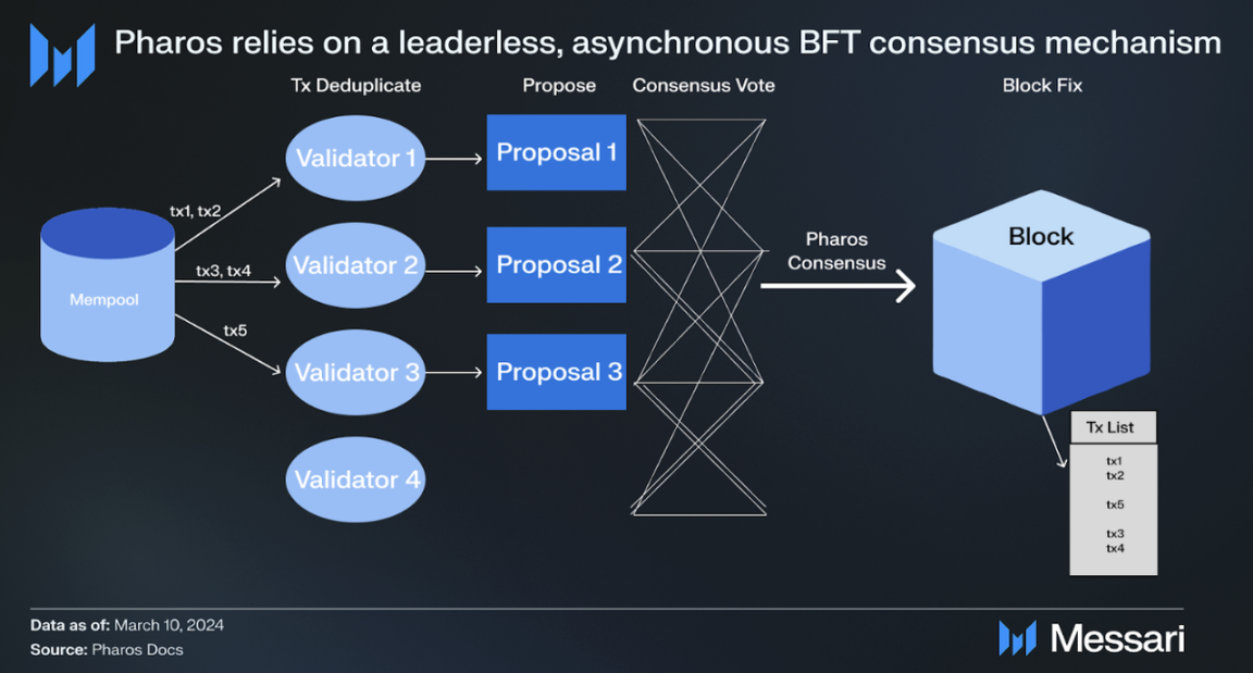 传统拜占庭容错(BFT)共识依赖单一节点提案出块,存在性能上限与单点故障风险。Pharos 通过全异步 BFT 协议突破限制,无需固定时间假设,验证节点可依据实际网络状态动态推进,而非被动等待超时。