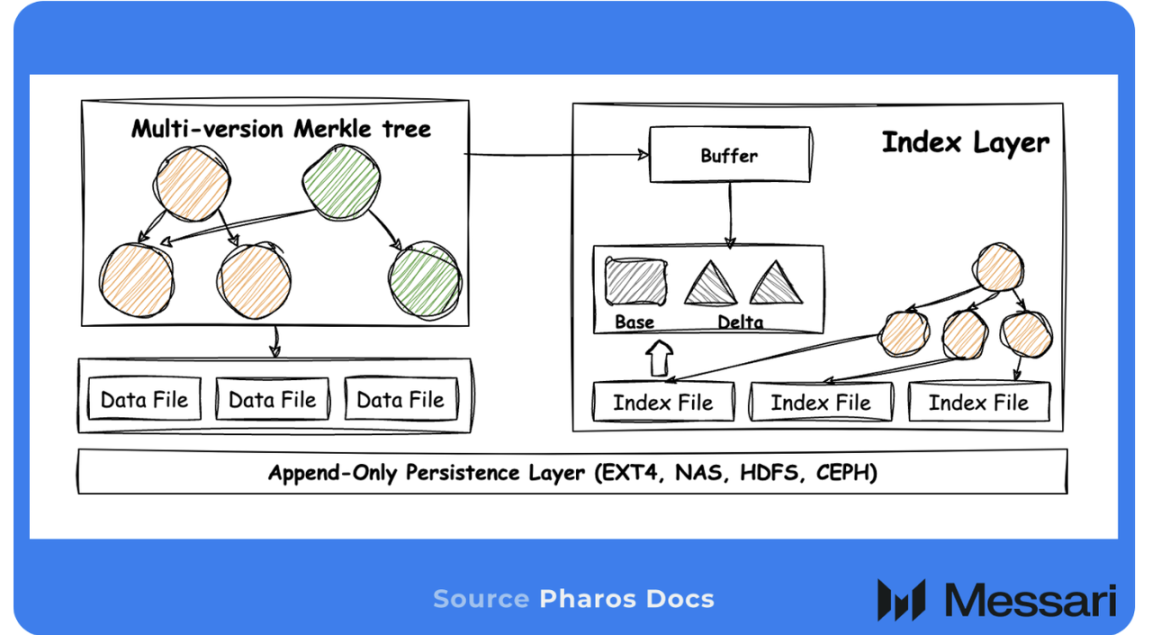 - Pharos Store 将默克尔树直接嵌入存储底层,把传统 8 至 10 次磁盘读取的 I/O 路径压缩至 1 至 3 次,解决多数高性能并行公链难以突破的隐形吞吐量瓶颈。