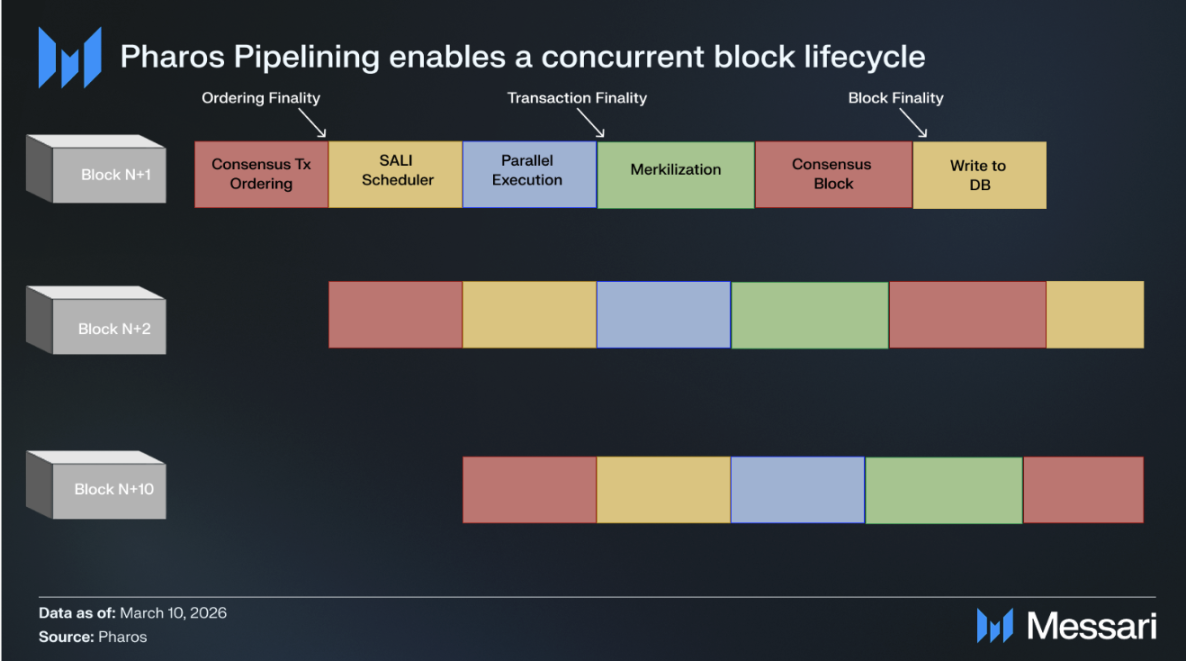 Pharos 将完整区块生命周期视为一个并行调度流程。团队认为,如果仅优化单一执行模块,网络最终仍会在存储 I/O 读写、共识确认、数据分发环节陷入严重性能瓶颈。