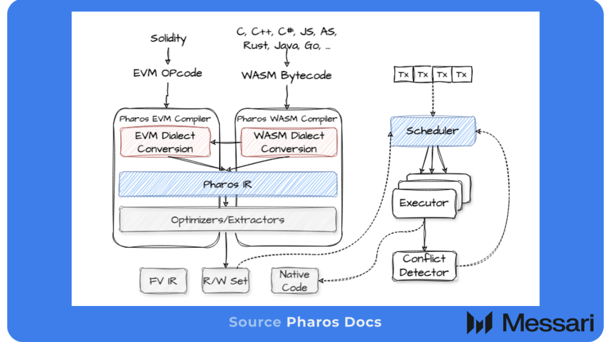- Pharos 将 EVM 和 WASM 统一到一个确定性虚拟机 (DTVM) 下,Solidity 合约可原生调用 Rust 合约,无需跨链桥或跨虚拟机的额外开销。