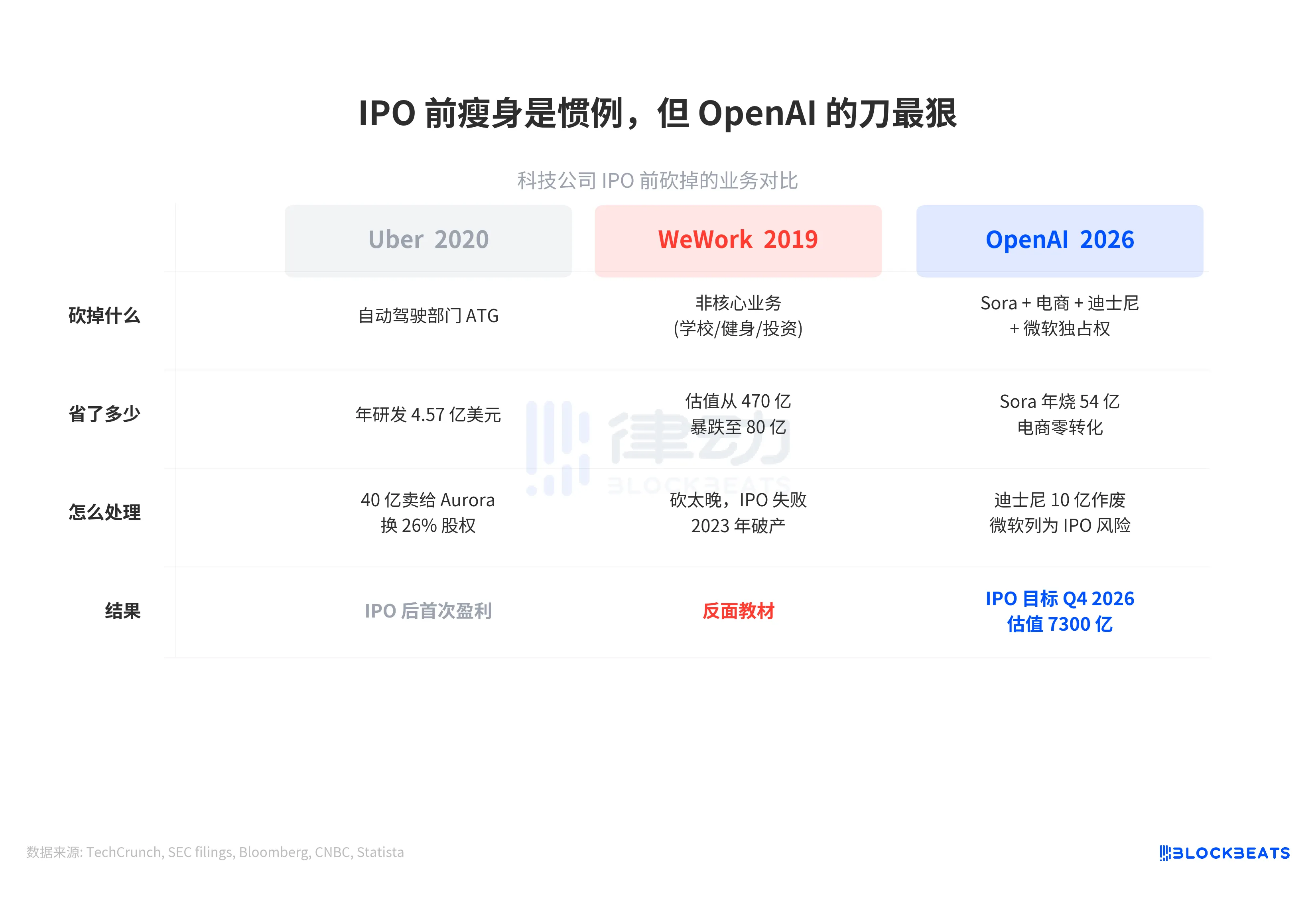 OpenAI 的操作跟 Uber 更接近:主动砍掉高成本低回报的业务线,在上市前把财务结构做干净。区别在于规模。Uber 砍的 ATG 年烧 4.57 亿,OpenAI 砍的 Sora 年烧 54 亿,差了一个数量级。加上迪士尼 10 亿作废、电商团队解散、微软关系公开降级,OpenAI 正在 IPO 冲刺期做科技史上最大规模的业务线清理。